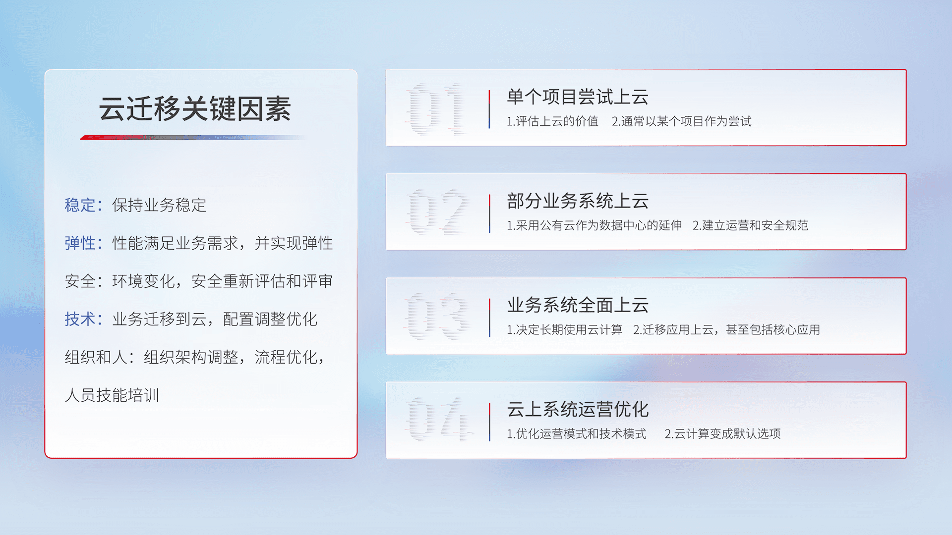 结合实际业务,,从规划设计、、云平台选型、、、云原生改造、、数据迁移、、、、集成交付,,,,迁移全过程为客户识别最佳上云路径,,做好风险识别管理,,,设计网络架构、、、、身份权限、、、、安全审计合规、、、操作审计、、日志审计、、、监控告警策略、、、、多站点容灾设计等,,,,对云上基础设施进行整体规划,,提升IT治理水平,,,以满足弹性、、、、高可用、、、、高性能的需求。。。