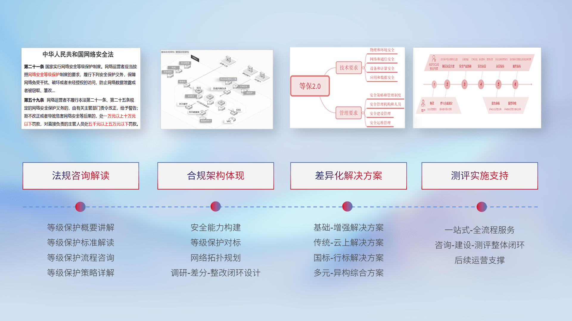 通过专业的法律咨询解读、、合规架构体现、、差异化解决方案、、、、测试实施支持等服务,,为客户量身打造等保合规体系。。